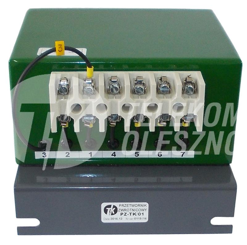 Przetwornik zwrotnicowy PZ-TK/01 przeznaczony jest do współpracy w obwodach kontrolnych napędów zwrotnicowych trójfazowych o sześciożyłowym układzie zasilania, współpracujących z klasycznymi układami nastawczymi typu N-86. Napięcie przemienne 110V, z obwodu kontrolnego, podane dwiema żyłami na wejście przetwornika jest w nim obniżane i prostowane, następnie kierowane jest do kolejnych dwóch żył obwodu kontrolnego. Każdemu z dwóch stanów zwrotnicy przyporządkowane są poprzez układ styków osobne obwody kontrolne. Tym sposobem w danym stanie zwrotnicy kontrolowane są cztery z sześciu żył zasilających. Przetwornik zwrotnicowy PZ-TK/01 przystosowany jest do pracy w warunkach środowiska zamkniętych szaf i skrzyń przytorowych.
